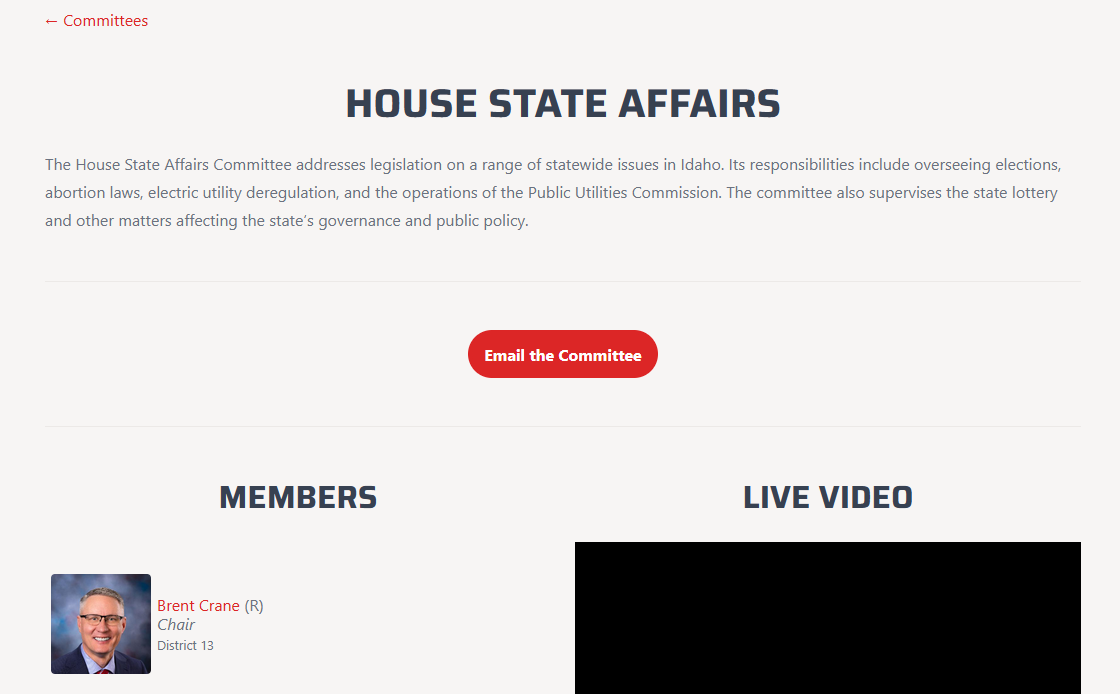 To that end, I’ve created pages for each legislative committee. Each committee page includes a short description of the committee’s role, a list of members with thumbnails and links to their Idaho Insider profiles, a live video window that will be active during the legislative session, as well as information about schedules, the committee secretary, and links to agendas and video archives.