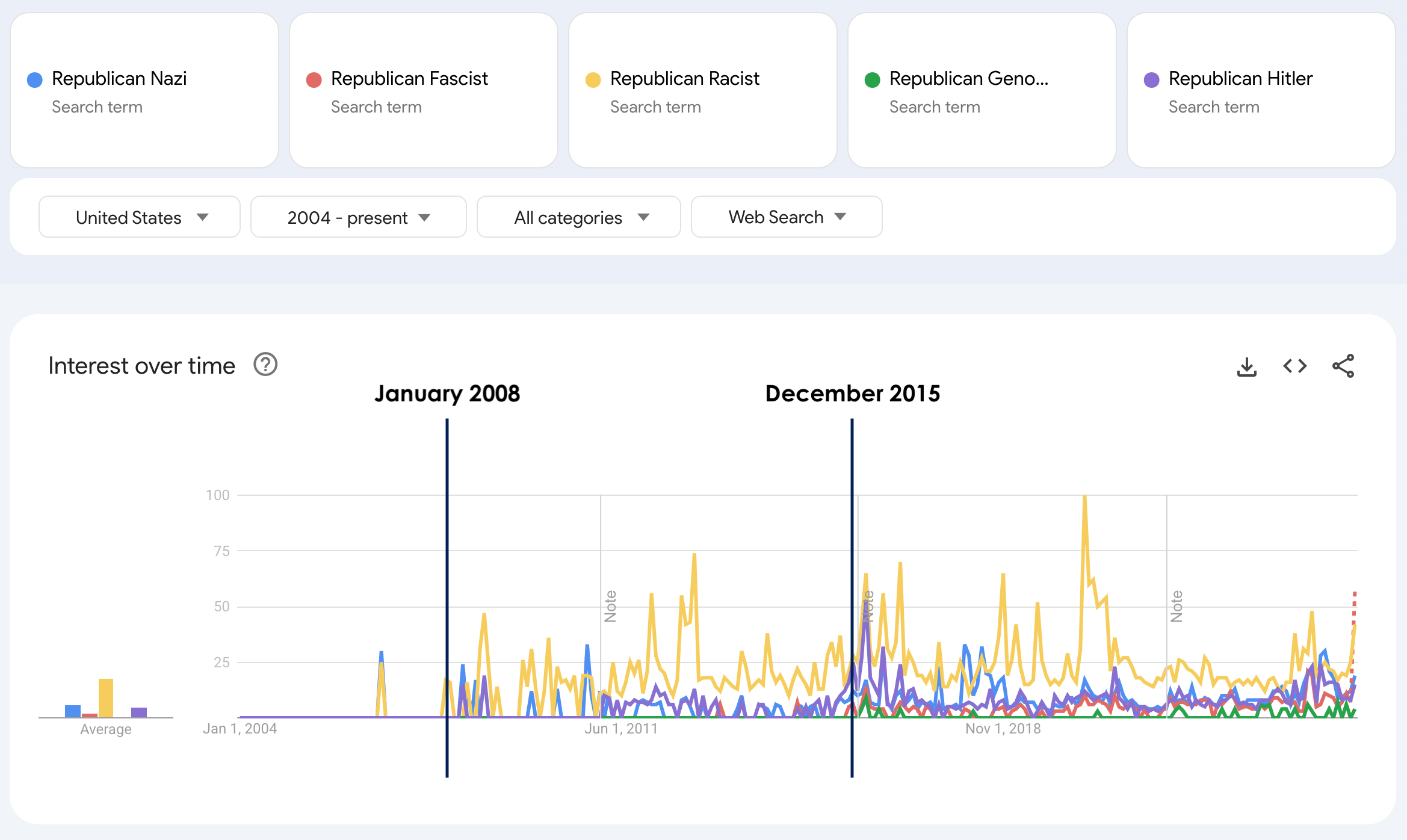 Many will say that this divide originates with the first Administration of Donald Trump and his mean words, but Google Trends tells a different story.  Google Trends tracks internet traffic dating to 2004, and it is during the first campaign of then-candidate Barack Obama that we begin to see a sharp rise in the American dialogue painting the right wing of America as Nazis, fascists, Hitler, racists, etc.. Then, during the 2016 Presidential campaign cycle, we began to see this language amplified.  It is when the mainstream corporate press adopted this vitriolic language that we began to see an increase in the amount of political violence. This vitriol culminated in then-President Joe Biden’s Reichstag speech denouncing the right wing as the enemy of the United States in front of Independence Hall against a blood-red backdrop.
