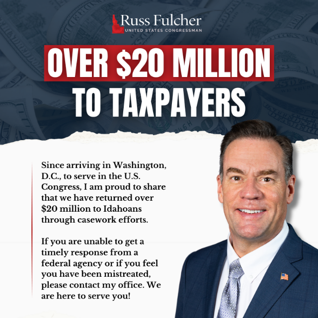 Since arriving in Congress, I am pleased to share that my terrific casework team has successfully returned over $20 million to hardworking Idahoans. This is money that was owed to constituents but was held up in a federal agency.