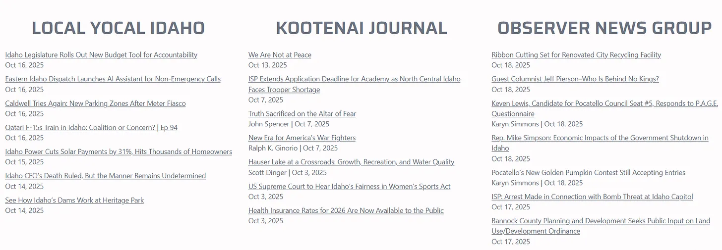 In the meantime, I’ve expanded my partnership with other Idaho news outlets on the front page of the Chronicle. While you’re browsing the latest posts, op-eds, and press releases, check out the latest headlines from Local Yocal Idaho, which is based in the Treasure Valley, the Kootenai Journal, based in North Idaho, and the Observer News Group, based in Pocatello.