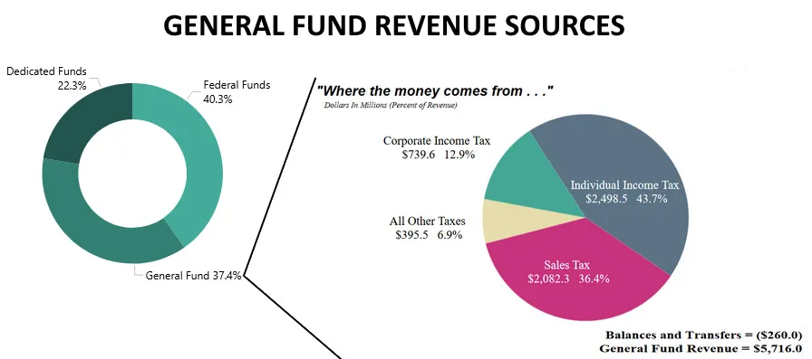 Other taxes and fees, such as hunting licenses or gas taxes, go into the Dedicated Fund, which finances specific items like wildlife management and highway maintenance.