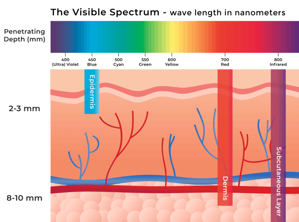 Red light therapy (RLT) is a non-invasive therapeutic treatment using low-level red and near-infrared light. These wavelengths penetrate the skin at depths of 8-10 mm, enhancing metabolic processes, supporting the nervous system, and boosting ATP (adenosine triphosphate; cellular energy) production (Levy).