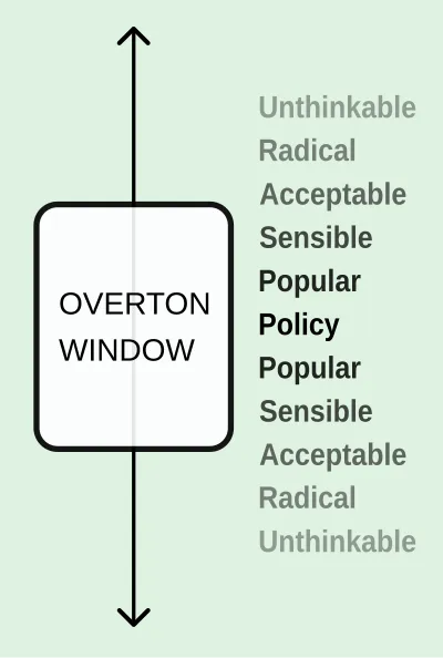 Factions that should be working together instead fight over who gets to set the tone. There’s a concept called the Overton Window, developed by political theorist Joseph Overton in the 1990s. It describes the range of ideas considered acceptable in public discourse at any given time.