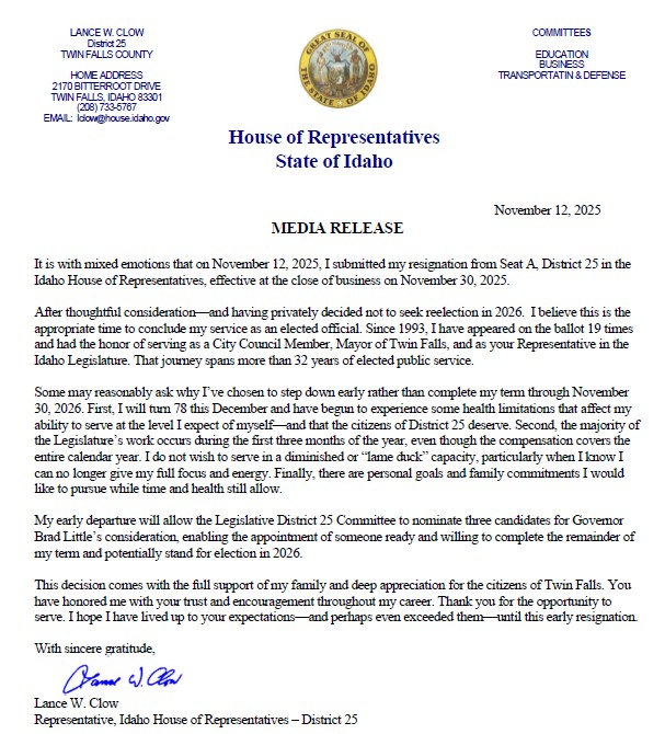 In a letter posted to Facebook this morning, Rep. Lance Clow (R–Twin Falls) announced his resignation, effective November 30. Clow wrote that he had already decided not to seek reelection in 2026 but chose to step down before the upcoming session due to health concerns and a desire to focus on personal goals and family commitments.