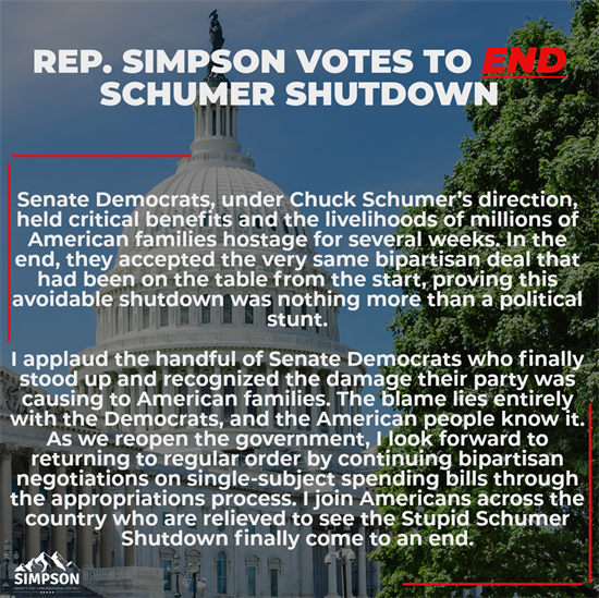 GREAT NEWS: The Schumer Shutdown is OVER. I was thrilled to help bring this completely avoidable 43-day government shutdown to an end. Make no mistake, this should have never happened. The Left deliberately shut down the government. And for what? They accepted the very same bipartisan deal that had been on the table from the start. Government shutdowns are bad politics and policy, and they HURT the American people. My full statement is below.
