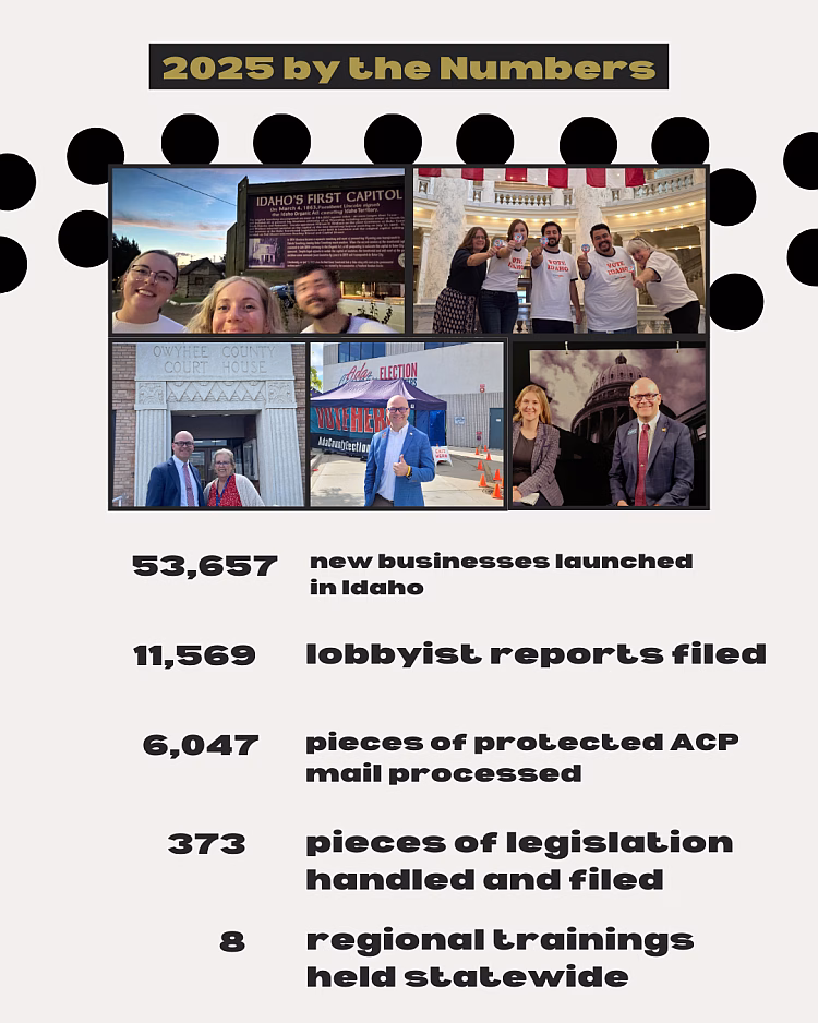 This year was busy, in the best way. Behind every number is a commitment to secure elections, open government, and service for Idahoans in every corner of the state.