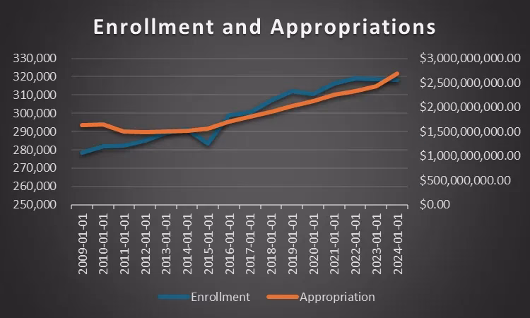 Using data from the legislative budget dashboard along with long-term enrollment numbers, I put together the following graph showing the increase in appropriations compared to the K-12 public school population. As you can see, appropriations have grown steadily, even as enrollment has leveled off: