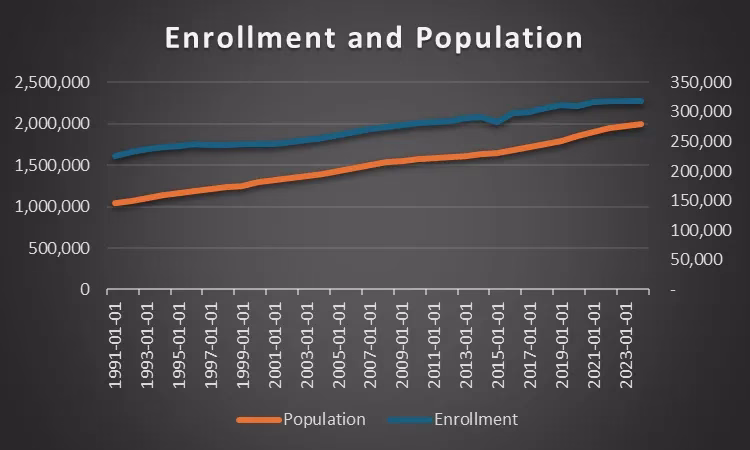 Your eyes are not deceiving you. Enrollment is growing much more slowly than population. I examined both figures going back to 1991 and found that the percentage of Idaho’s population enrolled in K-12 public schools has steadily declined—from 21.72% in 1991 to just 15.89% in 2024.