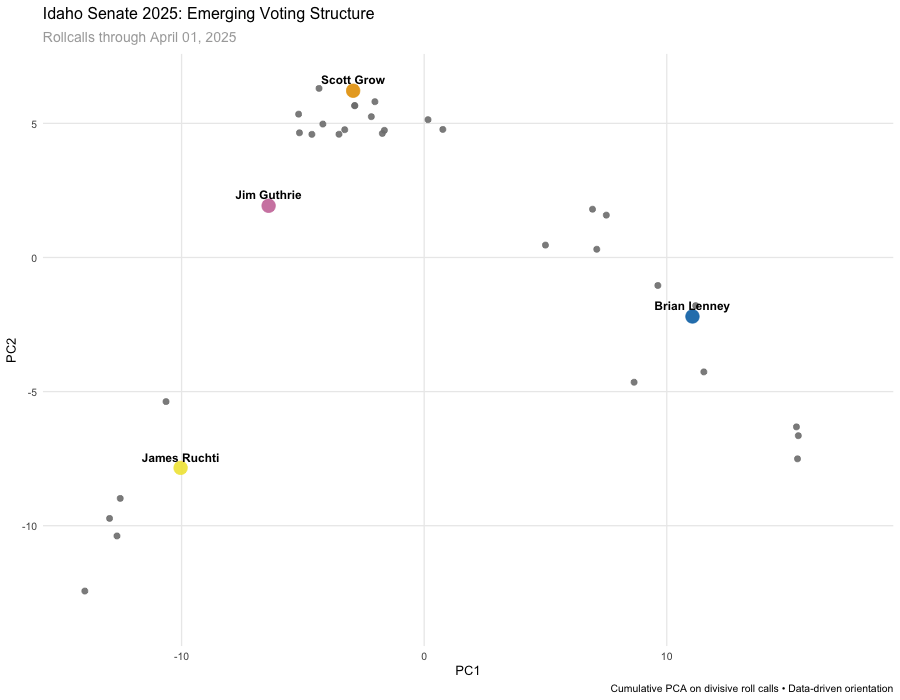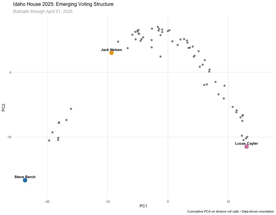 I’ll be using this technique to map the 2026 Idaho legislature in both houses once there are enough floor votes to run the analysis, and updating through the session. A few notes on changes from what I’ve described previously:
