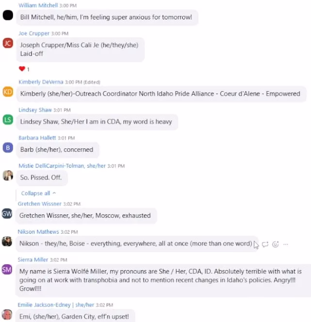Participants in Sunday’s call included Nikson Mathews, a transgender-identifying individual who is a candidate for the House in Boise, as well as Mistie DelliCarpini-Tolman, lobbyist for Planned Parenthood Alliance Advocates; Legal Voice’s Bill Mitchell; and others in the LGBTQ+ space.