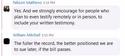 Organizers urged everyone to send written testimony to ensure a long paper trail for the inevitable lawsuit once this bill becomes law: