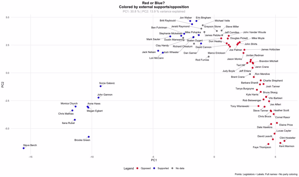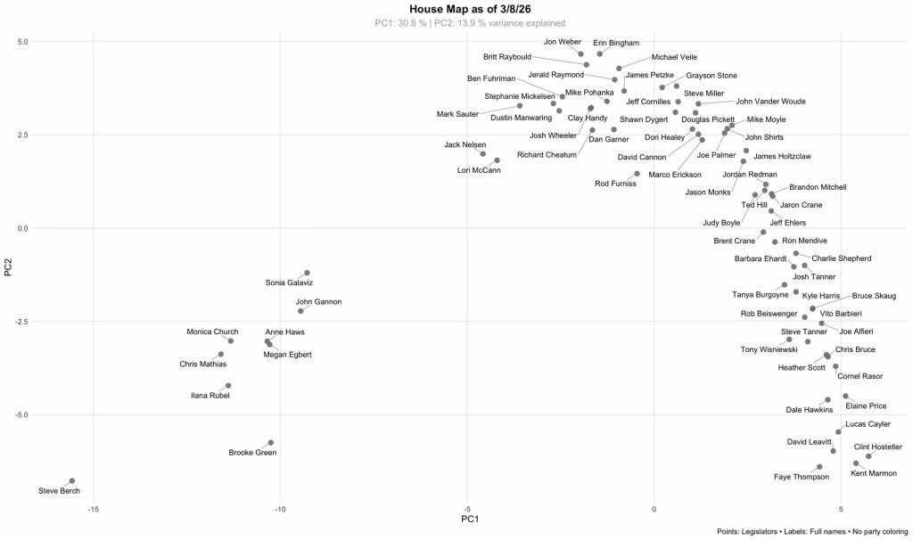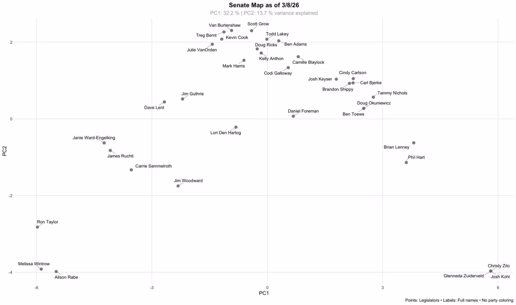 Note “R” Senator Woodward voting with the Democrat cluster, and Lent, Guthrie and Den Hartog in ‘D-adjacent’ positions. Meanwhile, the Gang of Eight’s Senate members continue to vote in lock step at the other end of the map.