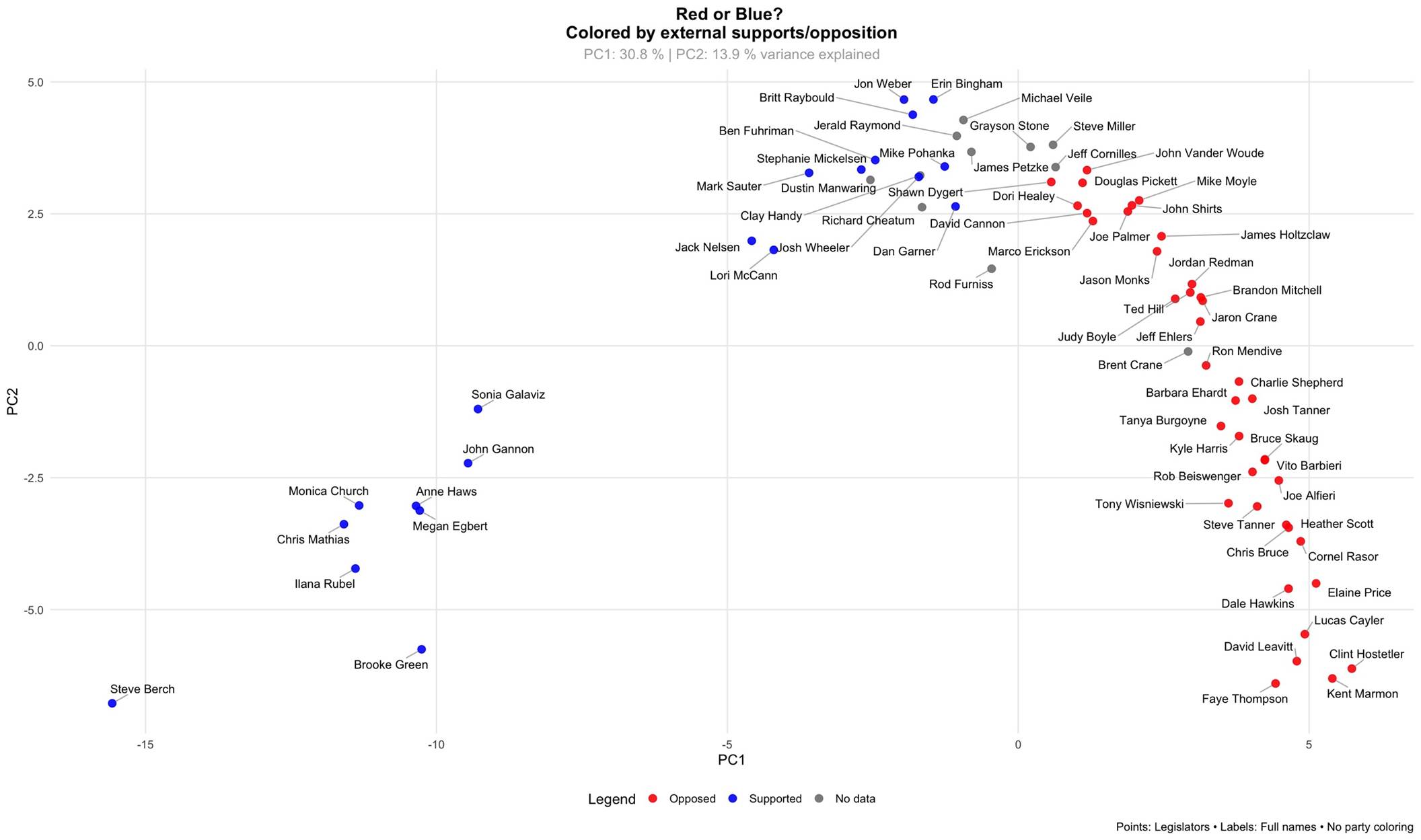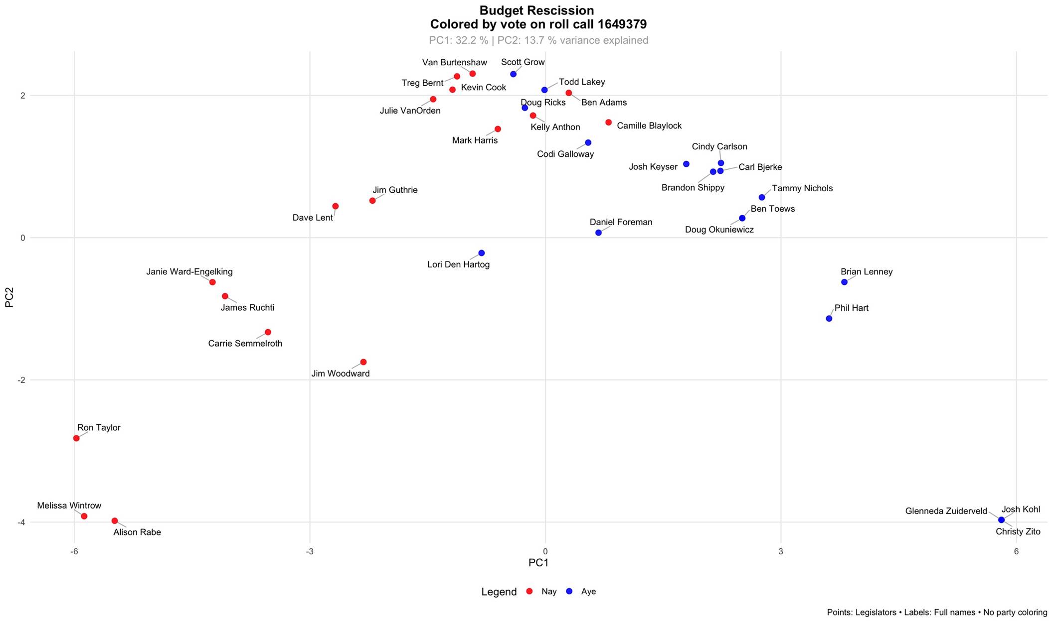 Those colored blue voted ‘nay’ on all of those bills. Credit where it’s due: Those colored red were ‘ayes’ on all. Those uncolored split their votes, or were absent for one or more. (Note that the legend on this chart is misleading. I’ve hijacked my usual aye/nay chart routine to give the traditional colors to the parties.)