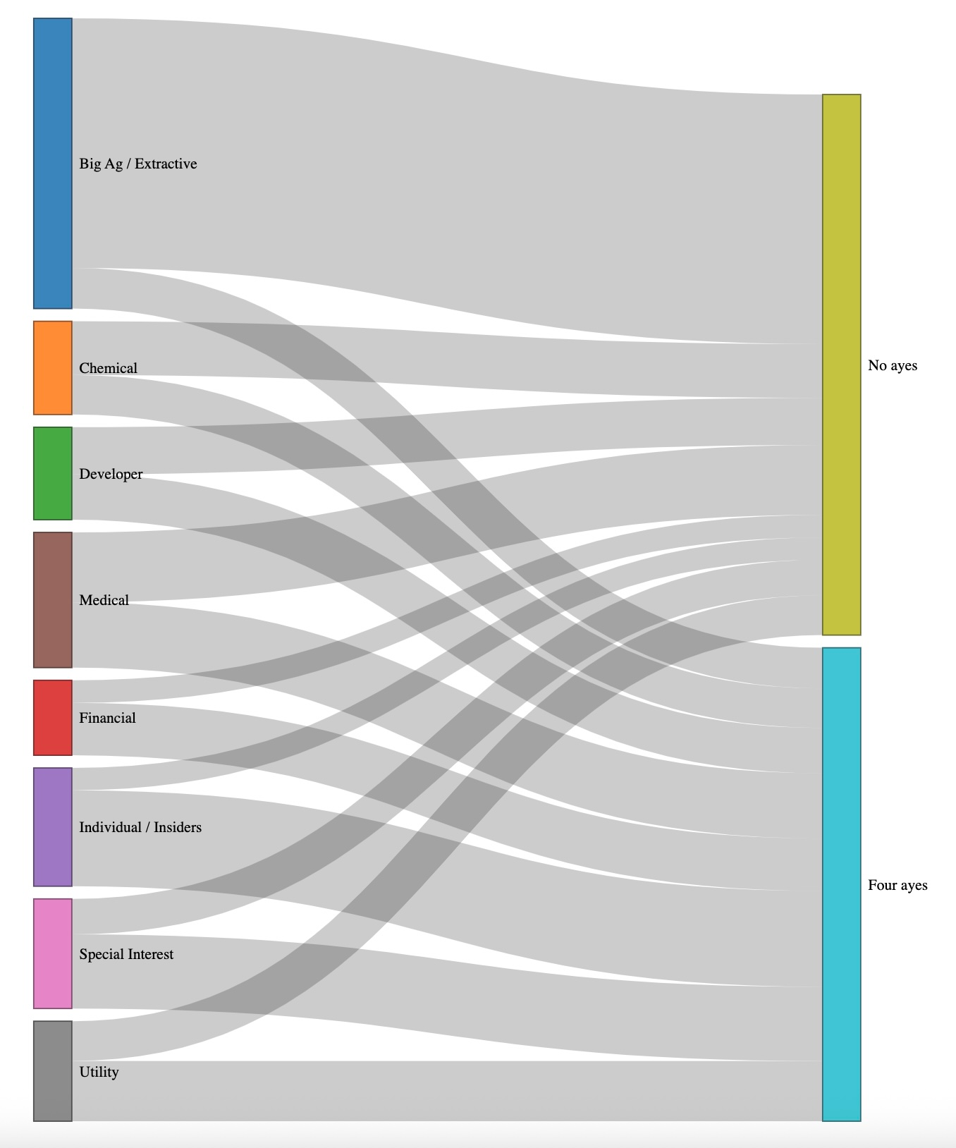I then totaled up the donations to those lists from various interest groups of campaign contributors. I’ll have more to say about this process in upcoming posts, but for now see the Afterword. Those totals went into something called a Sankey diagram, great for showing energy or cash flows: